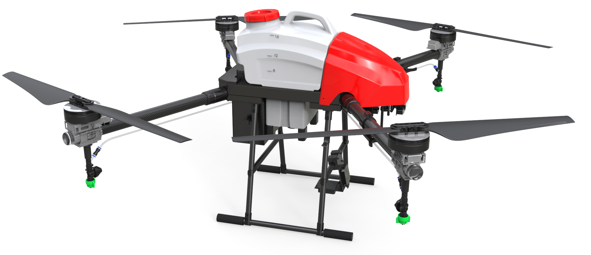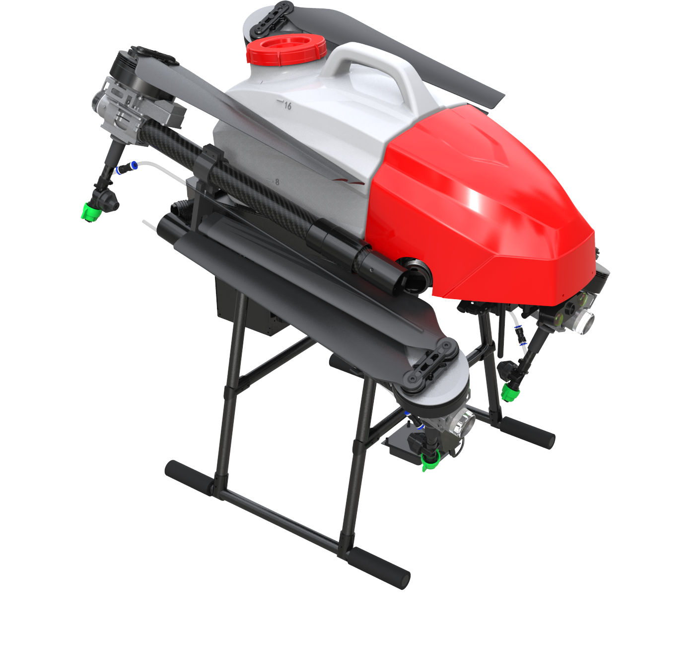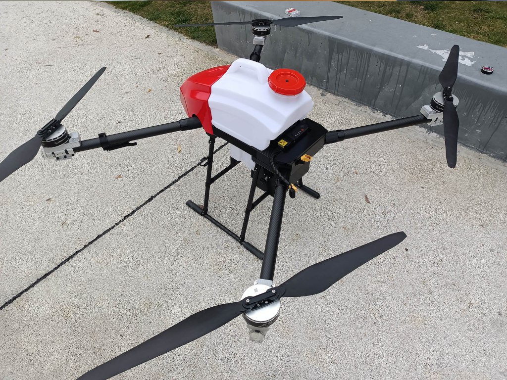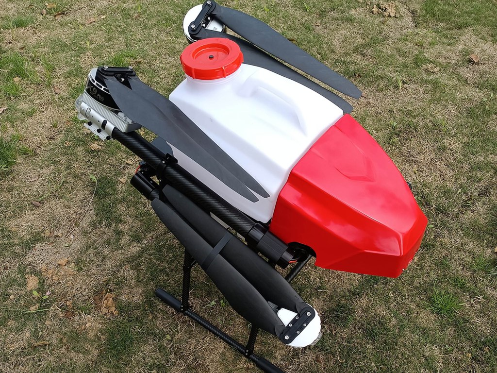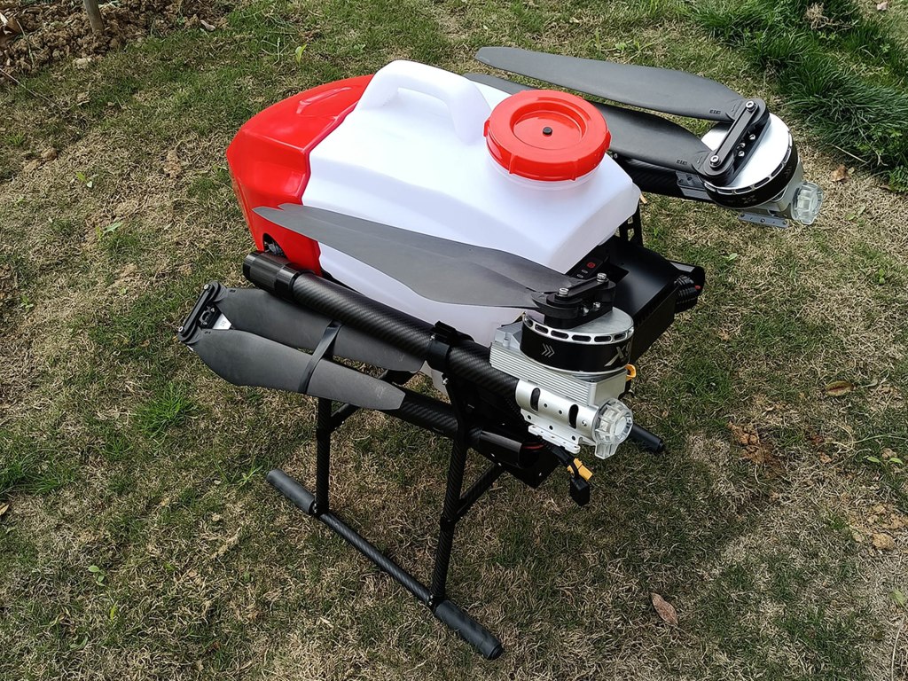 The F416 has a load capacity of 16kg and a 4.5-meter wide spray pattern. The efficiency of a single sortie is 1 hectare. It can dispatch 7-8 sorties per hour to complete about 7 hectares of land. At least 4 batteries are required to ensure uninterrupted operation of the drone. More efficient. Newest design.